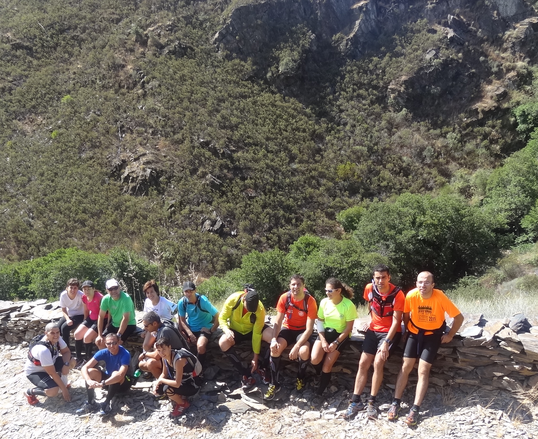 “A Minnie – uma simpática cadelita amarela surpreendida ao Km 11 com a passagem da ruidosa comitiva – teve hoje um dos mais felizes dias da sua vida. Ela nem sabia que havia quem corresse/progredisse fosse por onde fosse ao longo de horas. Mas é verdade, são os trail runners e em Portalegre essa doença está a tornar-se viral desde que o Atletismo Clube de Portalegre meteu braços à organização do UTSM. Hoje organizaram/mos a 2ª das 6 sessões de verão abertas a quem queira aparecer e foram 15 os corredores que às 7 h da manhã se reuniram na tasca da cascata para 3 h e meia de esforço controlado e sobretudo de muito convívio e cumplicidade. Correr/progredir é só o motivo porque o que mais nos importa é a qualidade das nossas vidas e saber desfrutar o que de excelente temos mesmo à porta. O rio Xévora, os montes de São Julião, a cascata do Monte Sete, as figueiras repletas de doces e suculentos figos, as amoreiras feridas de rubras amoras, o escorregadio leito do Xévora, o verde luminoso dos líquenes e a fresca manhã são sabores, odores e sensações que se sublimaram na tasca da cascata onde tudo terminou à mesa com uma saborosa feijoada de javali – como não javali para tudo ser genuíno! – preparada com amor e carinho pela Elisa Afonso e família. A Minnie lá regressou a casa procurada pelo dono já informado que tinha ido com os corredores e as mines Sagres da tasca da cascata lá foram ao seu destino final, as sequiosas bocas dos trail runnersde Portalegre e arredores. Tartarugas Inês, Vi e JC estiveram ON, a Amy ficou em casa à espera de umas sapatas novas e o JP está a amadurecer! Há-de cá vir parar também … ”