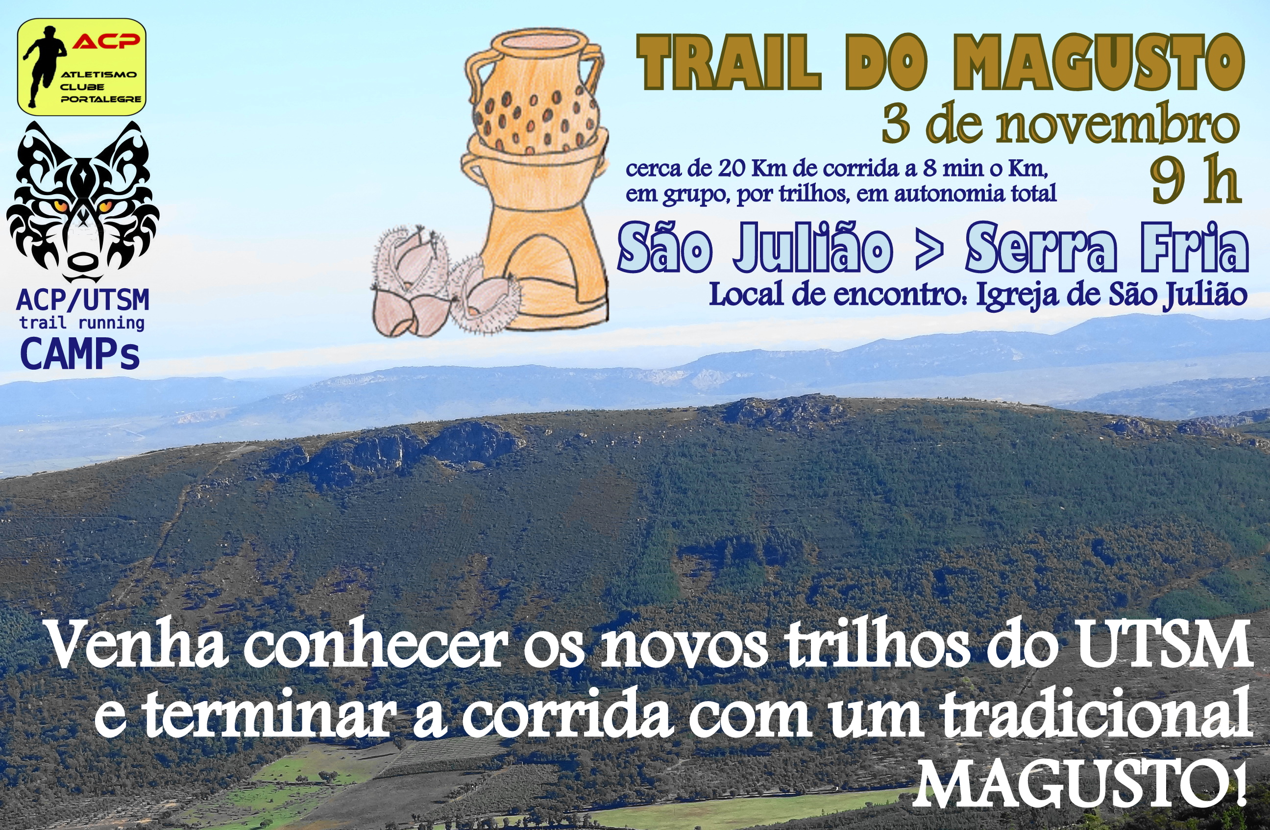 No próximo domingo, 3 de novembro, com início marcado para as 9 h junto à Igreja de São Julião, realiza-se o Trail do Magusto, um free trail (corrida em grupo com guias, não competitiva) centrado na Serra Fria pelos novos trilhos do UTSM. Serão cerca de 20 Km, 3 h a 4 h de grande convívio e comunhão com a natureza em autonomia completa. Termina com um magusto bem enquadrado no espírito da época. Se se sente atraído por este tipo de experiências e com capacidade física para as enfrentar adira aqui ao evento e saiba todos os pormenores da actividade inicial dos ACP/UTSM trail running CAMPs.