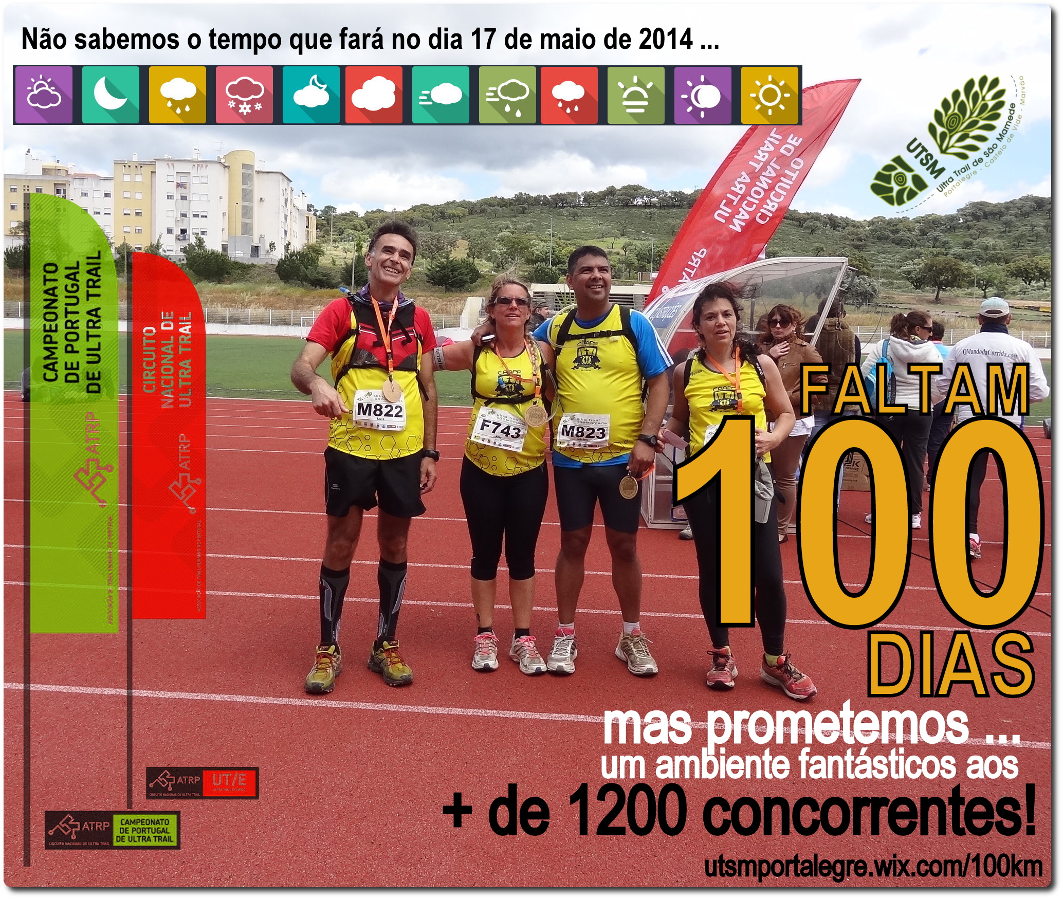 Ultrapassamos os mais de 1000 concorrentes 14 dias após a abertura das inscrições, com 650 concorrentes na emblemática corrida de 100 Km, e todos os recordes de participação em eventos ultra com 3 dígitos em Portugal a serem geometricamente ultrapassados. Muitos pedidos e muita reflexão fizeram com que hoje, a 100 dias da data do evento, abríssemos de novos a plataforma oferecendo mais 100 vagas – as derradeiras – para cada 1 dos 3 eventos: 100 Km UTSM, 42 Km TLSM e 24 Km TCSM. De hoje a exactamente 100 dias o Estádio dos Assentos estará ao rubro para a fabulosa Partida – à meia-noite! – dos mais de 700 concorrentes ao UTSM. Será um momento emocionalmente superlativo, como o muito bem sabem os que estiveram no estádio em 2013. No dia 17 de maio será algo com o triplo da dimensão. A 100 dias do evento apelamos a todos os habitantes dos concelhos de Portalegre, Castelo de Vide e Marvão, onde o evento decorre ao longo de 24 h, que se nos reúnam enquanto voluntários ou enquanto apoiantes dos fabulosos ultra resistentes atletas que nos visitam. Tal como já aconteceu na Baja com os TT e nos 100 Km dos Ases do Pedal com o BTT, Portalegre torna-se, com o UTSM e o trail running a capital portuguesa dos desportos de resistência em plena natureza. Mostremos a Portugal e ao mundo o que o Alto Alentejo tem de melhor: genuinidade, entrega, saber receber e um fabuloso património natural e cultural.