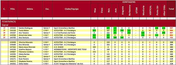 Na Classificação Geral Feminina Paula Matos subirá à tribuna como 2ª classificada num campeonato que reuniu 15 maratonistas do trail (7 do ACP) das quais 5 (3 lobas) conseguiram classificar-se. Vejamos a tabela das heroínas: