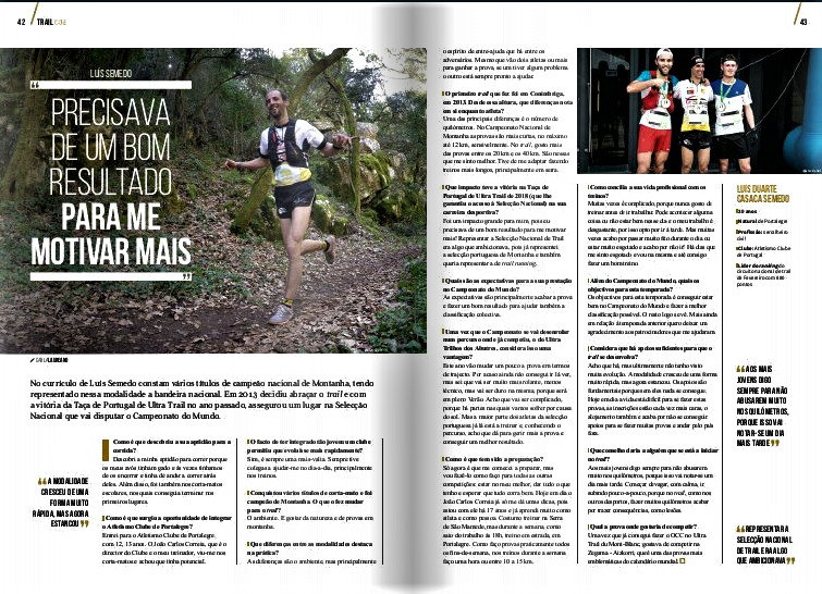 Luís Semedo (ACP) é um dos 9 atletas masculinos que representarão Portugal – entre mais de 50 selecções – no Campeonato do Mundo de Trail que vai realizar-se no nosso país (Miranda do Corvo) no próximo dia 8 de junho a partir das 9 h. Luís Semedo lidera o Ranking Nacional de Trail que é actualizado mensalmente com o máximo de pontos possível (880) praticamente desde o seu aparecimento em janeiro de 2017 e é uma das referências da modalidade no nosso país pela sua maneira própria de estar, pela regularidade e, evidentemente, pela grande qualidade em distâncias até aos 40 / 50 Km. A revista Running publicou no seu último número, o 29, nas páginas 42 e 43, uma entrevista com o campeão portalegrense que referenciamos neste artigo. Não é fácil conseguir um lugar nesta selecção pelo que esta presença será sempre um marco na carreira do Luís tanto mais que há a expectativa de Portugal poder vir a integrar o TOP5 na classificação final. Um orgulho para o ACP desempenhar o papel que desempenha na carreira do Luís e que ele não esqueceu de referir nesta entrevista.