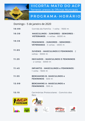 Domingo, entre as 10 h e as 12 h 30 m, organizamos nos terrenos anexos às Oficinas Municipais (a seguir à rotunda da Prio, com entrada única para o recinto junto ao Canil Municipal) a 3ª edição (série III) do Corta-Mato do ACP. No circuito com 1500 m de extensão, muito amplo e aprazível mas que ficará bastante enlameado, evoluirão mais de 200 atletas que se inscreveram nas 7 provas do Programa que contempla todos os escalões etários oficiais. Logo pelas 10 h todos os interessados poderão percorrer o circuito na denominada Corrida da Família. Às 10 h 30 m começa a competição e logo com a prova principal, a destinada aos Juniores, Seniores e Veteranos. Publicamos em anexo o Programa-Horário completo para que possa seguir a par e passo o desenrolar dos acontecimentos. O evento integra o Circuito AADP de Corridas e para a sua realização o ACP contou com o apoio do Município de Portalegre, da União das Freguesias da Sé e São Lourenço, Real Spot, Forn’Alentejano, Cafés Palmeira, Francisco Gil Automóveis, Clínica de Santa Beatriz e da AADP e do seu Conselho de Arbitragem. O Corta-Mato do ACP inaugura uma série de eventos que o ACP organizará em 2020. O UTSM será o momento alto mas muita expectativa estão a gerar também as Jornadas Técnicas, já em 26 de janeiro, e as 4 etapas do São Mamede Adventure Trail – 4 estações que decorrerão em 23 de fevereiro (inverno), 29 de março (primavera), 12 de julho (verão) e 20 de setembro (outono), cujos aspectos inovadores e pormenores organizativos serão dados a conhecer dentro de dias.