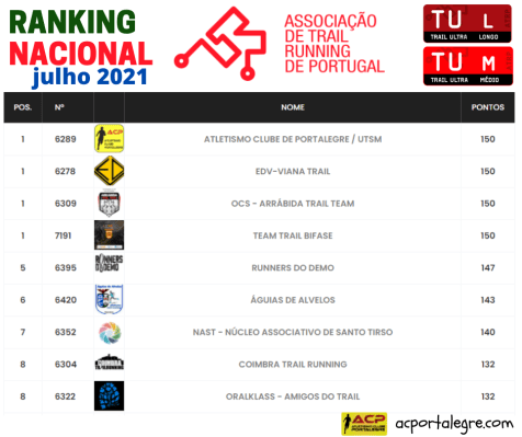 O ACP – Atletismo Clube de Portalegre é uma das 4 equipas que soma 150 pontos – máximo possível, correspondendo a 6 vitórias coletivas em provas de nível nacional nos últimos 36 meses – co-liderando por conseguinte o Ranking Nacional de Trail Ultra (distâncias entre os 42 Km e os 100 Km). A equipa portalegrense ascende a esta posição após a vitória do passado sábado no Ultra Trail de Santa Cruz. O ACP tem 58 atletas filiados na ATRP e participa regularmente nas competições nacionais em todas as distâncias (Trail, Trail Ultra e Trail Ultra Endurance). Com este feito o clube iguala no mais elevado escalão do pódio nacional a prestação do seu atleta Luís Semedo que ainda é um dos co-líderes nacionais nas distâncias até à Maratona (Trail Curto e Trail Longo). A todos os que contribuem para este desempenho, nomeadamente atletas, suas famílias e seus técnicos, os nossos parabéns!