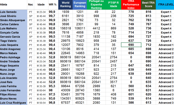 Mais dados globais: 8 dos nossos atletas estão no nível Expert, 35 no Avançado, 29 no Intermédio e apenas 3 no Noviço. Temos 2 atletas acima dos 800 pontos e 9 no patamar 700 > 800, que já revela muita qualidade. A lista é global e o índice é semelhante para masculinos e femininos, o que obviamente prejudica as concorrentes femininas numa comparação direta, mas mesmo assim temos 8 no nível Avançado, particularmente significativo porque várias delas são veteranas de categorias mais avançadas, com longas carreiras que continuam e o índice é calculado a partir dos resultados dos últimos 3 anos e sem qualquer fator valorativo devido à idade.