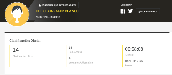 Odilo Gonzalez Blanco (ACP) classificou-se em 14.º – entre 180 concorrentes – nos 12 Km Cross de Valdiguelo disputado ontem em Santa Marta (Extremadura). Correu os 12 Km do percurso em 58 m 08 s tendo sido 4.º na sua categoria etária (M40). Para além de nos representar em eventos por essa Europa fora e de promover amiúde desafios com características solidárias, Odilo organiza no próximo dia 9 de outubro o excelente Trail de Alconchel e convida-nos a uma participação no seu evento. Lá estaremos! Inscrições a decorrer aqui!