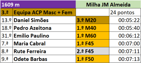 Com 6 participações e 6 pódios individuais por categoria etária o ACP esteve presente, no sábado à noite, em São Vicente e Ventosa, na Milha Noturna José Mário Almeida, prova que homenageou o ex-praticante de Elvas. Muitos parabéns a todos.