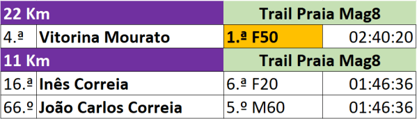 Vitorina Mourato (ACP) classificou-se em 4.ª da Geral e venceu a sua categoria etária nos 22 Km D+ 800 m do Trail Praia do Magoito disputado hoje por 59 concorrentes (14 senhoras) no Parque Natural de Sintra – Cascais. Na distância curta 11 Km D+ 400 m entraram em liça dois outros elementos da família, Maria Inês e João Carlos Correia, que se classificaram em 81.º e 82.º da Geral de 178 concorrentes. Aos 3 os nossos parabéns.