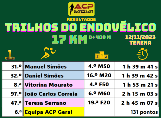 Casa cheia em Terena (Alandroal) para a estreia de mais uma boa organização alentejana, os Trilhos do Endovélico. O ACP esteve presente com 5 corredores na distância curta que conseguiram a 6.ª posição coletiva. Individualmente Vitorina Mourato foi 8.ª da Geral (4.ª F50-59) e Manuel Simões também ficou à beira do pódio no escalão M50-59. Parabéns aos 5.