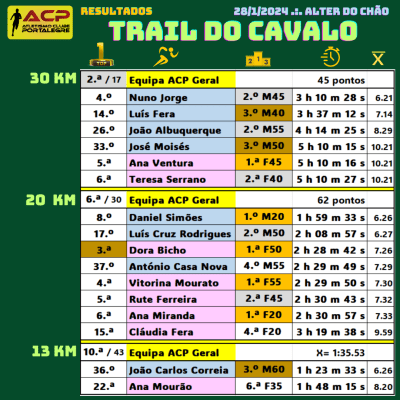 Os 16 atletas do ACP que hoje se apresentaram em Alter para a 6.ª edição do Trail do Cavalo conseguiram a 2.ª posição coletiva na mais longa das 3 distâncias (Nuno Jorge, Luís Fera, João Albuquerque), o 3.º lugar feminino na distância intermédia por Dora Bicho, 5 vitórias individuais por categoria etária: Daniel Simões 1.º M20 nos 20 Km; Dora Bicho 1.ª F50 nos 20 Km; Vitorina Mourato 1.ª F55 nos 20 Km; Ana Miranda 1.ª F20 nos 20 Km e Ana Ventura 1.ª F45 nos 30 Km, para além de 14 TOP3. Digna de destaque especial também a 4.ª posição absoluta de Nuno Jorge nos 30 Km.
