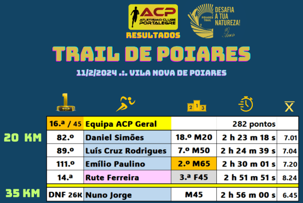 Emílio Paulino (ACP) 2.º M65 e Rute Ferreira (ACP) 3.ª F45 estiveram em particular evidência no Poiares Trail que conheceu a 10.ª edição na chuvosa manhã de domingo. O ACP participou com um quinteto que conseguiu a 16.ª posição na distância intermédia. As dificuldades técnicas do percurso agravaram- se com as más condições atmosféricas e levaram mesmo Nuno Jorge, que seguia TOP20 nos 35 Km, a ter que abandonar após 2 aparatosas quedas. À Rute, ao Luís, ao Daniel, ao Nuno e ao Emílio o nosso obrigado e os nossos parabéns pela presença em Vila Nova de Poiares.
