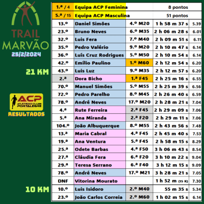 Vitória da equipa feminina, 5.º posto da masculina, 2.ª posição absoluta de Dora Bicho e 6 lugares de pódio por categoria etária (Dora Bicho 1.ª F45, Emílio Paulino 1.º M60, Rute Ferreira 2.ª F45, Ana Miranda 2.ª F20, nos 21 K; Luis Isidoro 2.º M40 e João Correia 2.º M60, nos 10 K) marcaram a excelente presença da Alcateia ontem no Trail de Marvão. Positiva a numerosa presença da Alcateia (23 atletas) com algumas estreias e um nível médio muito bom numa manhã que colocou à prova, pela adversas condições atmosféricas que tiveram de enfrentar, a capacidade e o empenhamento dos 228 concorrentes (143 nos 21 K e 84 nos 10 K) que participaram no evento. A todos os nossos parabéns e o nosso muito obrigado.