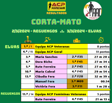 Maria Sanches destacou-se no domingo em Elvas ao classificar-se em 3.ª no Corta-Mato que um ano mais homenageou o saudoso António Leitão. Conjuntamente com Dora Bicho, 4.ª, e Rute Ferreira, 5.ª – que na véspera correra em Reguengos de Monsaraz o Campeonato do Alentejo onde conseguiu a 4.ª posição F45, conseguiu para o ACP a vitória coletiva no Distrital da especialidade. Escassas 12 horas antes disputara-se o Campeonato do Alentejo da especialidade não se conseguindo compreender como as supostamente 2 mais importantes competições da época da especialidade são disputadas com este intervalo de tempo. O ACP participou residualmente em ambas, mas sem grande influência na dinâmica das mesmas bem patente no excelente de número de classificados em Reguengos (247) e em Elvas (109).