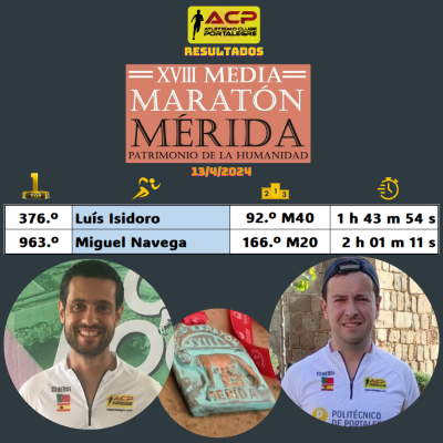 Luís Isidoro (ACP) e Miguel Navega (ACP) correram ontem ao fim do dia a 18ª edição da Meia-Maratona de Mérida que não para de crescer no número de participantes tendo ontem classificado 1700 dos 2500 corredores inscritos. A grande dificuldade de ontem foi contudo o inusitado calor para abril (mais de 30ºC) que obrigou todos os corredores a refrearem o ritmo para conseguirem terminar. Deixamos o habitual quadro com as classificações e os resultados dos nossos atletas. A todos os que participaram os nossos parabéns.
