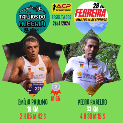 Emílio Paulino (ACP) e Pedro Parelho (ACP) alinharam no domingo em dois eventos na zona centro. Emílio completou os 19 Km dos Trilhos do Alecrim, centrados em Serro Ventoso e no Parque Natural das serras de Aire e Candeeiros, em 2 h 05 m 42 s, conseguindo a 2.ª posição M65 e a 39.ª (entre 106) da Geral. Um pouco a nordeste Pedro ligava a correr os 33 acidentados Km que ligam Dornes a Ferreira do Zêzere, a maior parte nas margens do rio Zêzere, em 4 h 30 m 15 s, que lhe permitiram alcançar a 7.ª posição M45 e a 25.ª de uma Geral que classificou 67 corredores masculinos. A ambos os nossos parabéns por mais dois exigentes desafios superados.