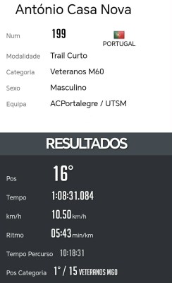 António Casa Nova (ACP) correu hoje a 2.º edição dos 12 Km do Trail da Granja, às portas de Lisboa, vencendo o seu escalão M60 e conseguindo ainda um TOP 20 de uma geral com 130 classificados. Foi a preparação para o EPIC Trail Açores dentro de 2 semanas na qual participará com mais 3 atletas do ACP.