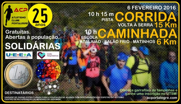 A Corrida e a Caminhada terão uma vertente solidária. Vamos tentar ajudar duas instituições fantásticas da nossa região: a Unidade de Ensino Estruturado para o Apoio à Inclusão de Alunos com Perturbações do Espetro do Autismo do Agrupamento de Escolas José Régio de Portalegre e o Centro de Recuperação de Menores D. Manuel Trindade Salgueiro de Assumar. Vamos começar a reunir tampinhas e caricas (separadas) e também moedinhas de 1 € (uma por participante).