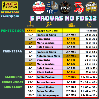 Daniel Simões (ACP) e Emílio Paulino (ACP) conseguiram no domingo classificações TOP 50 entre os 316 classificados no III Trail Coração do Ribatejo disputado a partir da Chamusca. Conseguiram correr os 20 Km da distância intermédia das 3 que constituíram o evento em pouco mais de 2 h, facto bem significativo para o Emílio que compete já no escalão M65 em que, uma vez mais, fez pódio (2.º). A ambos os nossos parabéns e o nosso agradecimento por representarem o clube no evento.