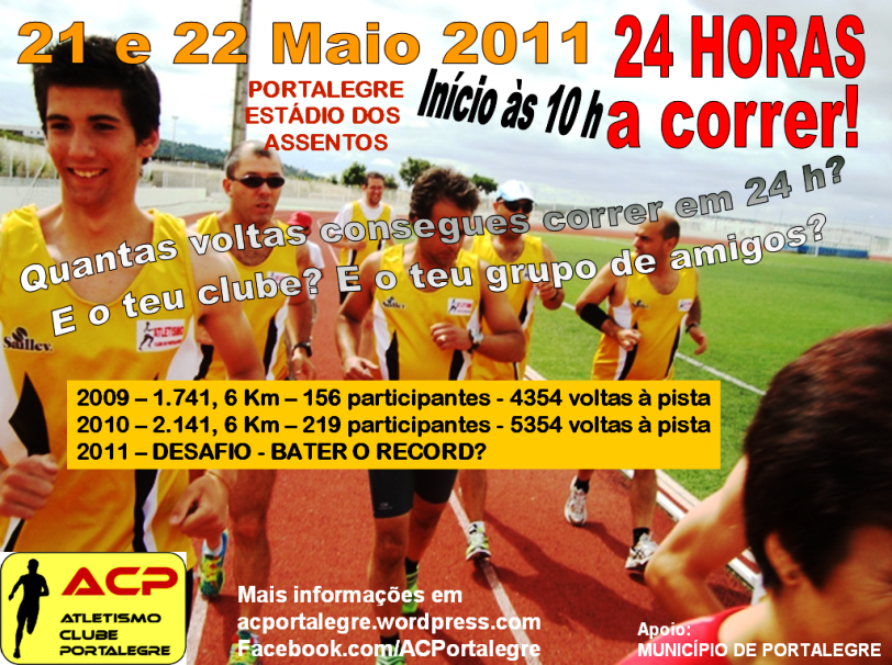 Entrados em Abril … Maio já espreita! E Maio em Portalegre é um grande mês! É o mês das Maias, é o mês da maratona BTT e … é o mês das nossas 24 h a Correr! As duas primeiras edições foram um grande êxito. O principal objectivo do evento é que o conjunto dos participantes percorra a maior distância possível ao longo das 24 h e que haja sempre pelo menos um corredor em pista. Em 2009 cento e cinquenta e seis praticantes de corrida entraram 466 vezes na Pista do Estádio dos Assentos, em Portalegre, para correrem ou caminharem um total de 4354 voltas e perfazerem assim a distância de 1.741, 6 Km. Na 2ª edição, em 21 e 22 de Maio de 2010, percorreram-se 2141, 6 Km e 219 corredores ou caminhantes entraram na pista 511 vezes que percorreram 5354 vezes. Vamos superar estes números a partir das 10 h do próximo dia 21 de Maio? Vamos!