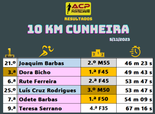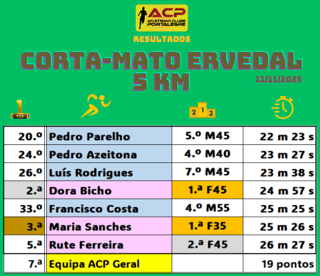 Iniciou-se no sábado a época regional de corta-mato, no tradicional percurso de Ervedal, com a presença de 111 concorrentes e o ACP esteve presente com 7. O destaque vai inteirinho para as 3 lobas que participaram no evento, Dora Bicho, Maria Sanches e Rute Ferreira, que numa agradável prova feminina com 19 concorrentes conseguiram as 2.ª, 3ª. e 5.ª posições. Aos 7 magníficos que nos representaram e conseguiram a 7.ª posição entre 24 equipas os nossos parabéns e o nosso obrigado.