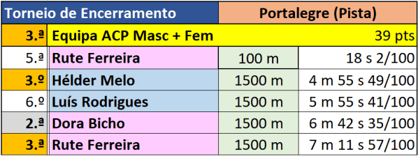 Um quarteto de atletas do ACP participou no sábado, em Portalegre, no Torneio de Encerramento de Pista, conseguindo a 3.ª posição coletiva no Campeonato AADP de Absolutos, que se disputou em simultâneo. Na tabela indicamos as classificações e os resultados dos nossos atletas a quem agradecemos a presença.