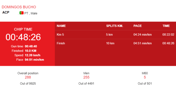 Domingos Bucho (ACP) regressou aos eventos nos 10 Km Vodafone, o evento gémeo da meia-Maratona da Ponte, concluído por 9925 concorrentes no dia 8, em Lisboa. Apresentou-se em excelente forma tendo sido o 5.º de 501 concorrentes M60 e o 255.º de 4491 concorrentes masculinos. Correu a distância abaixo dos 50 minutos em 48 m 26 s. A prova integrou-se na preparação para o Campeonato Nacional de Meia Maratona Masters 2022 que se vai realizar no próximo domingo em Lagos. Parabéns e boa sorte.
