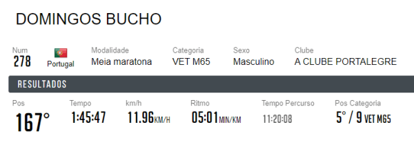 Domingos Bucho (ACP) classificou-se em 5.º lugar M65 na Meia-Maratona de Lagos, 4.º no Campeonato Nacional de Meia-Maratona da ANAV (Associação Nacional de Atletismo Veterano). Correu a distância em cima da 1 h 45 m, a 5m o Km. Muitos parabéns.