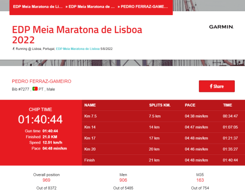 Pedro Gameiro (ACP) classificou-se em 906.º (entre 5485 participantes masculinos classificados) na EDP Meia-Maratona de Lisboa disputada no dia 8. Correu-a em 1 h 40 m 44 s. Mais um dos resultados ACP conseguidos durante o furacão UTSM e que agora resgatamos. Muitos parabéns.